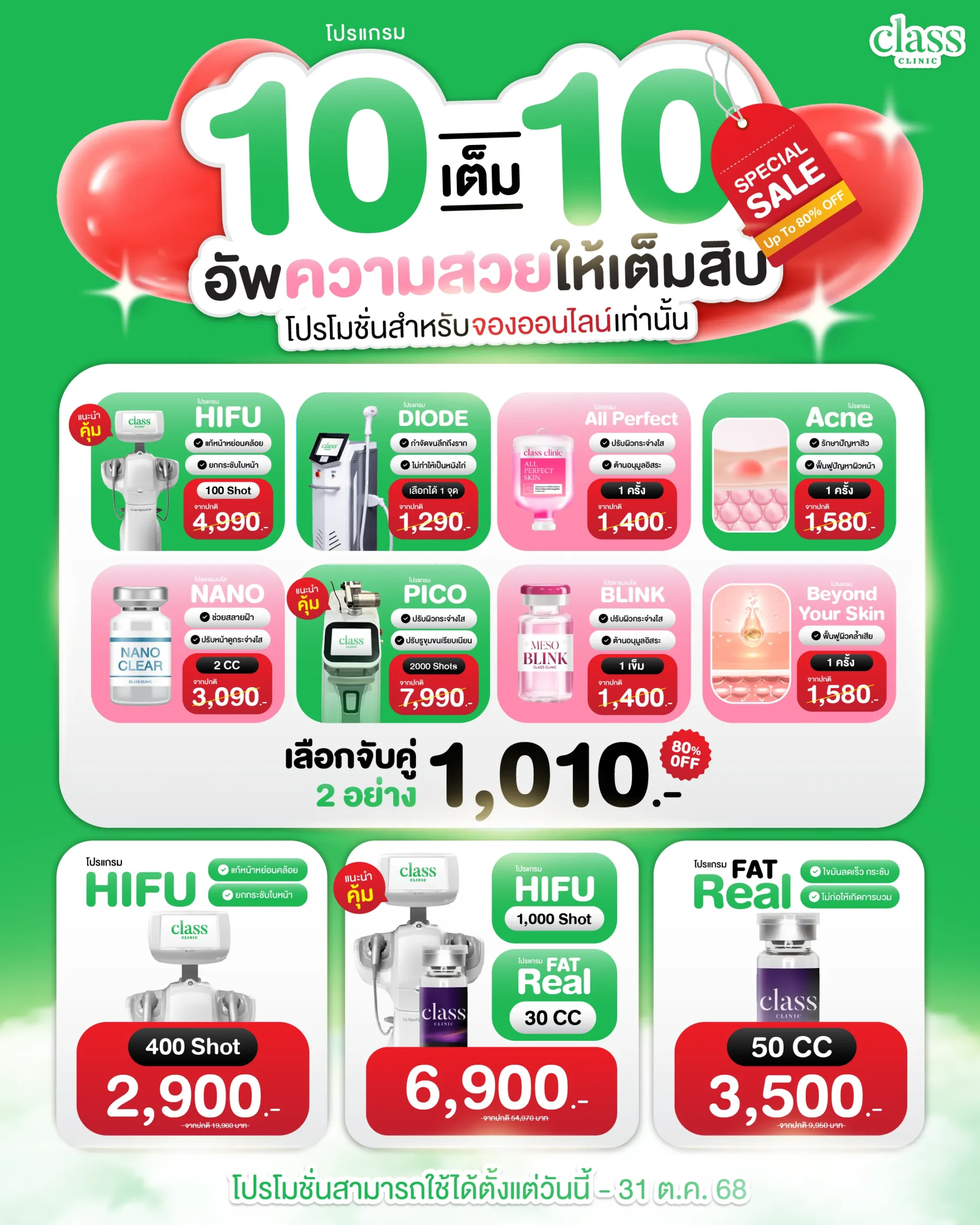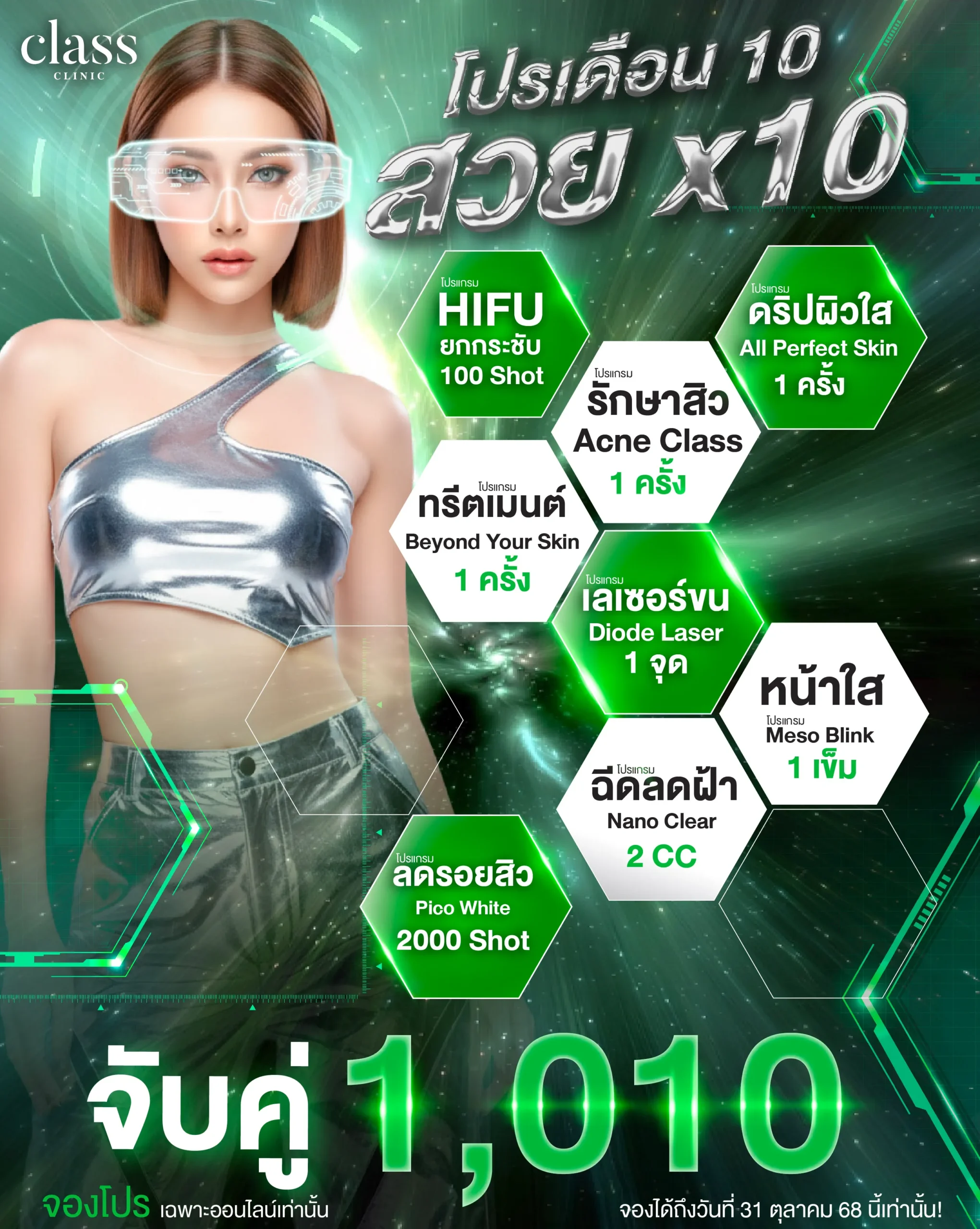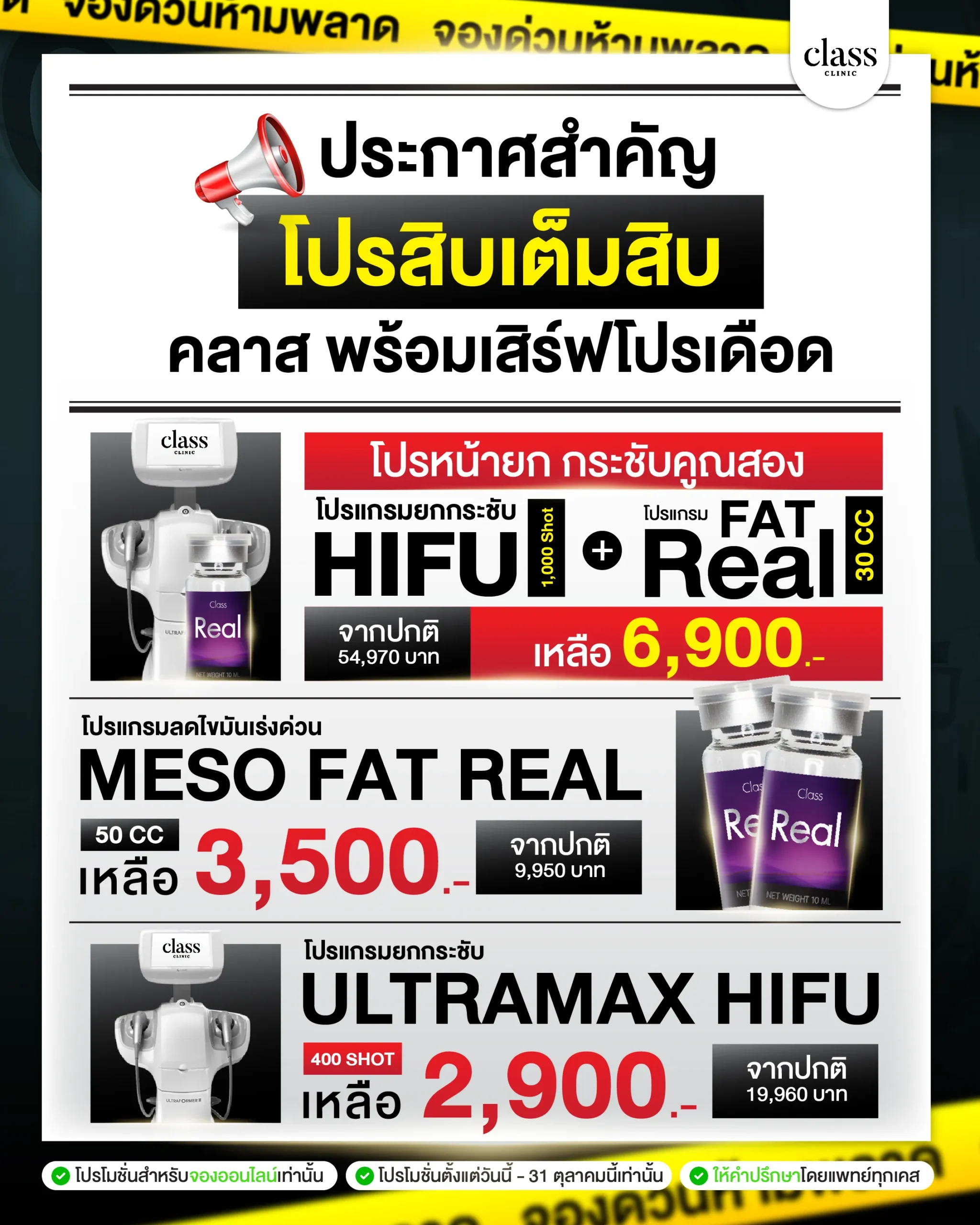 Class Clinic คลินิกความงาม ขอนำเสนอ โปรโมชั่น Class clinic ตอบรับความต้องการและประสิทธิภาพในการดูแลความงามของคุณด้วยบริการที่ครบครันและมาตรฐานสากล ไม่ว่าจะเป็นบริการโบท็อกซ์, ดริปวิตามินผิว, การฉีดฟิลเลอร์, เลเซอร์, ร้อยไหม, เมโสสกิน, เมโสแฟต, หรือทรีทเม้นท์ พลาดไม่ได้แล้ว กับโปรโมชั่นพิเศษจากเรา